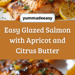 Apricot scotch glazed salmon with charred citrus butter is a sophisticated yet easy dinner featuring juicy, flaky salmon brushed with a sweet, smoky glaze and finished with a bright, charred citrus-infused butter.