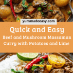 A rich, comforting Thai-inspired Massaman curry made with tender beef, earthy mushrooms, creamy potatoes, and coconut milk, finished with bright lime for balance.
