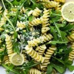 A fresh and tangy pasta salad with tender pasta, peppery arugula, crisp vegetables, and a zesty lemon dressing, perfect for spring and summer meals.