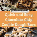 Chocolate chip cookie dough bars are a no-bake treat that delivers all the flavor of raw cookie dough—safely. Made with heat-treated flour and no eggs, these bars are soft, sweet, and topped with a fudgy chocolate layer for the perfect indulgent bite.