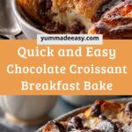An indulgent chocolate croissant breakfast bake with flaky croissants soaked in rich custard and melted chocolate, baked until golden, soft, and comforting with crisp edges.
