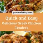 Juicy and flavorful Greek chicken tenders marinated in lemon, garlic, and Mediterranean spices, then cooked to perfection for a simple and satisfying dish.