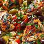 Greek chicken orzo is a one-pan Mediterranean dish combining tender chicken, lemony orzo, fresh herbs, cherry tomatoes, olives, and feta. It’s hearty, fresh, and packed with bright, savory flavors.