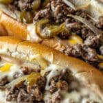 A quick and budget-friendly take on classic Philly cheesesteaks made with juicy ground beef, sautéed onions and peppers, and melted cheese served in warm hoagie rolls.