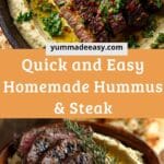 Leftover steak can be stored in an airtight container in the fridge for 2–3 days and reheated gently in a skillet. Hummus keeps well for up to a week in the fridge. I don’t freeze hummus often, but it can be frozen for up to 2 months if needed—thaw completely and stir well before serving.