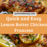 Lemon Butter Chicken Francese is a classic, elegant dish featuring tender chicken cutlets dredged in flour and egg, pan-fried to golden brown, and served in a silky lemon-butter sauce. It’s fresh, tangy, and rich—perfect for a quick yet impressive meal.