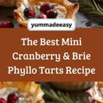 Mini Cranberry & Brie Phyllo Tarts are elegant, bite-sized appetizers featuring creamy Brie cheese, tangy cranberry sauce, and a touch of honey in a crisp phyllo shell. Perfect for holidays or entertaining, they’re simple to make and always a hit.