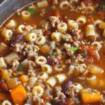 Pasta e Fagioli Soup is a hearty Italian-American dish inspired by Olive Garden, featuring ground beef, beans, veggies, and pasta in a flavorful tomato broth. It’s comforting, affordable, and perfect for cozy dinners or weekly meal prep.