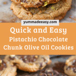 Soft, chewy cookies made with olive oil, roasted pistachios, and dark chocolate chunks for a unique, rich, and nutty twist on the classic chocolate chip cookie.