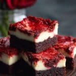 They taste great chilled, but I sometimes let them come to room temperature or warm them for a few seconds in the microwave for that soft, fudgy bite. I don’t recommend freezing them with the cheesecake layer, as the texture can change. Red Velvet Cheesecake Brownies