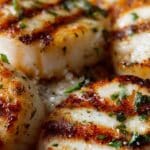 Elegant grilled sea scallops seasoned with garlic, olive oil, and paprika, quickly cooked to achieve a golden sear with a tender, juicy center.