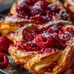 These Sugar Raspberry Danish Buns are soft, golden swirls of buttery dough filled with sweet-tart raspberry jam and finished with a delicate sugar glaze. They combine the richness of a classic Danish pastry with the fluffy texture of a cinnamon roll, and I love how the raspberry adds a burst of fruity brightness to every bite.