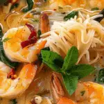 Thai Shrimp Coconut Noodle Soup is a rich and vibrant dish combining juicy shrimp, tender noodles, and a silky coconut‑milk‑based broth infused with Thai red curry paste, garlic, ginger, fish sauce, and lime. It’s creamy, spicy, fragrant, and perfect for when you want a comforting Asian‑inspired meal.